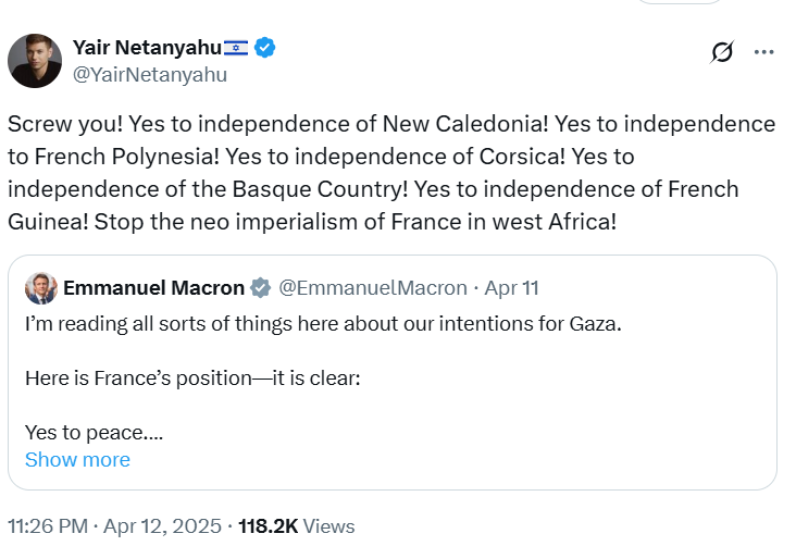 Tensions escalated when Netanyahu’s son, Yair Netanyahu, launched a vulgar tirade on social media. Responding directly to Macron, Yair tweeted: “Screw you!” and demanded independence for Corsica, French Polynesia, French Guiana, and other French territories. He accused France of “neo-imperialism in West Africa.”