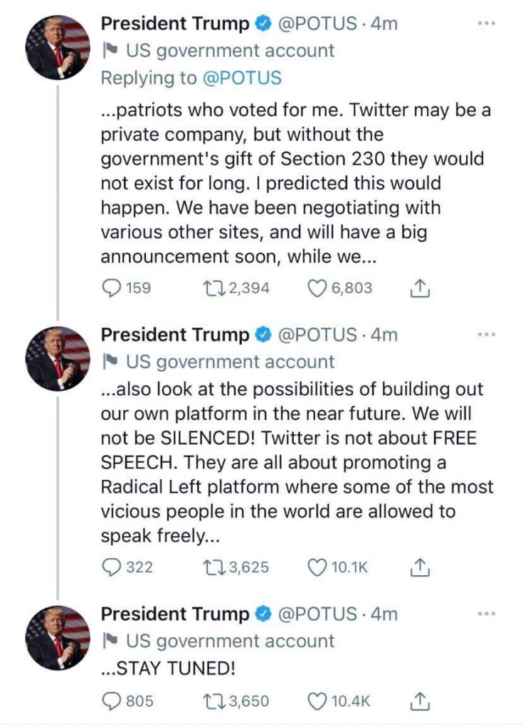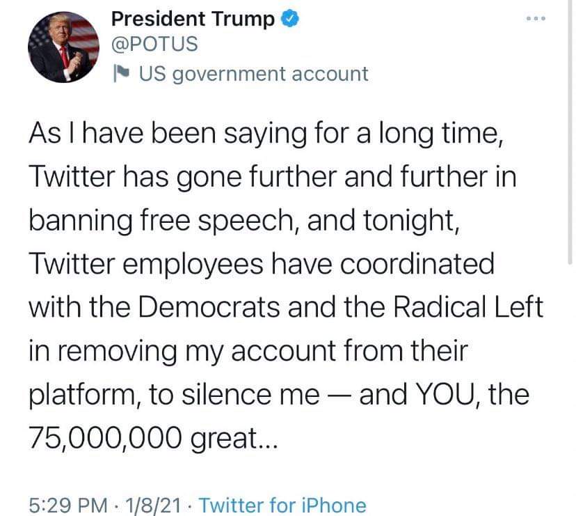 "Twitter employees have coordinated with the Democrats and the Radical Left in removing my account from their platform, to silence me—and YOU, the 75,000,000 great patriots who voted for me," Trump said.