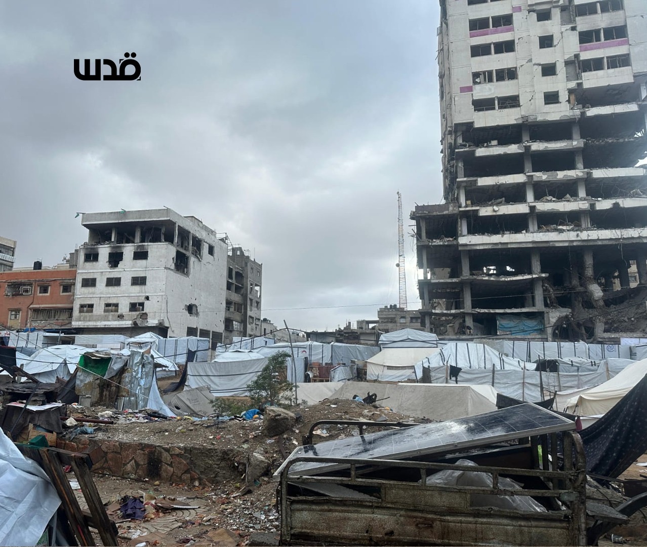 “I used to enter this building with awe,” she says. “It made me feel small in a good way, small because Gaza was grand. I never imagined I would be living inside a tent here, in the same place I once entered dressed for conferences and ceremonies.”