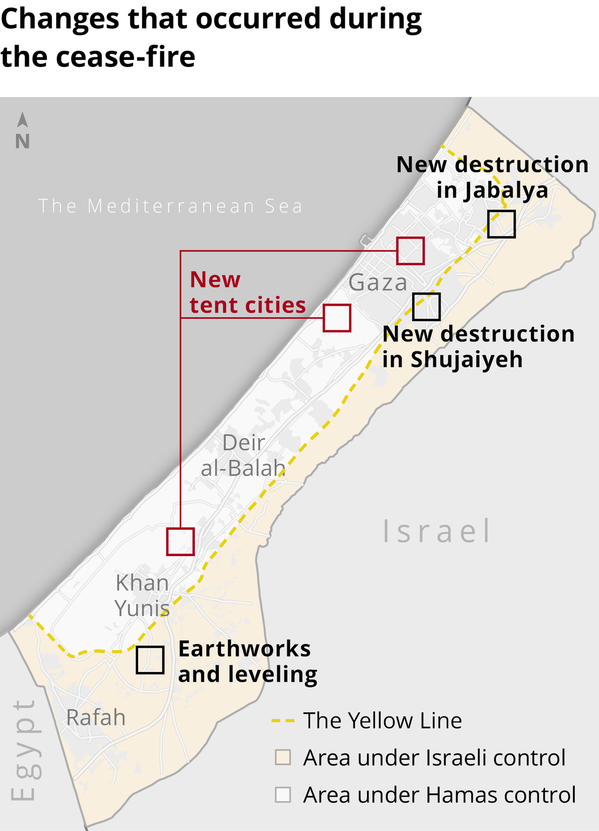Haaretz said on Thursday, citing satellite images, that the “Yellow Line” in some cases extends hundreds of meters into territory that is officially supposed to be under Palestinian control. The images also show zones of destruction that have expanded since the ceasefire began, including in Jabalia and the Shujaiyeh neighborhood, both within and beyond the area under Israeli control.