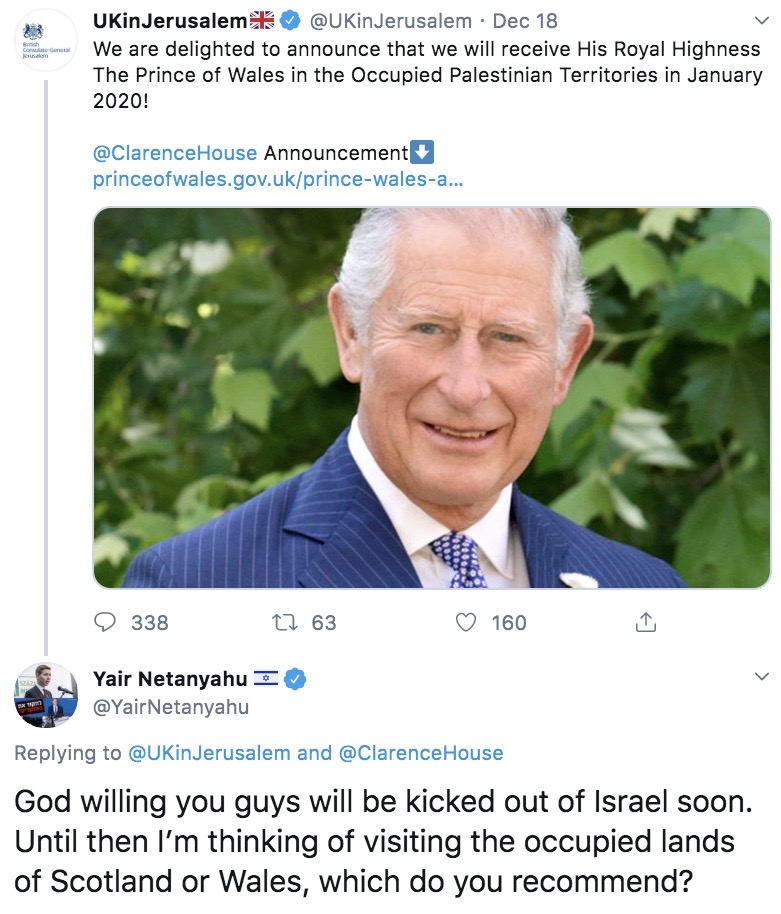 The prime minister’s middle child, Yair, who is known for his strange and racist statements on social media, made the comment in response to an announcement that Prince Charles was making his first visit to the area in January.