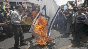 Iranian protesters burning Israeli flag during Quds Day protests.