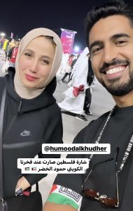 Natalia Papadopoulou and Saba Shamaa, social media influencers, wear pro-Palestine armbands while attending the World Cup 2022 opening ceremony in Qatar.Kuwaiti singer and music producer Humood Alkhudhuder wears Palestine armband.Canadian-based journalist Muna Hawwa and Palestian sport content creator Mohamed Adnan wear Palestine armbands.