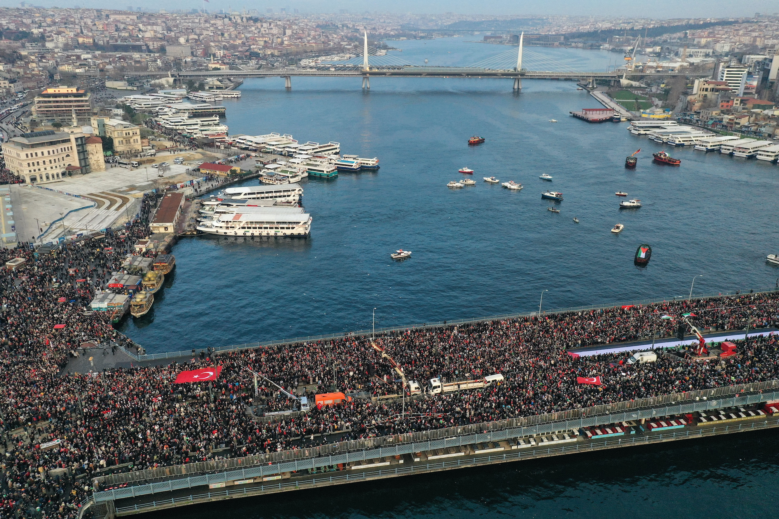 After the prayers, the massive crowd proceeded to march towards the Galata Bridge, displaying signs in Turkish, Arabic, and English to voice their stance against Israeli actions in Palestine.
