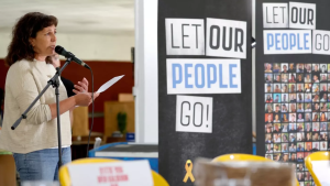 Released Israeli prisoners Liat Beinin Atzili speaks at a passover ceremony in Nir Oz to call for the release of the remaining prisoners on 11 April 2024 (Jack Guez/AFP)