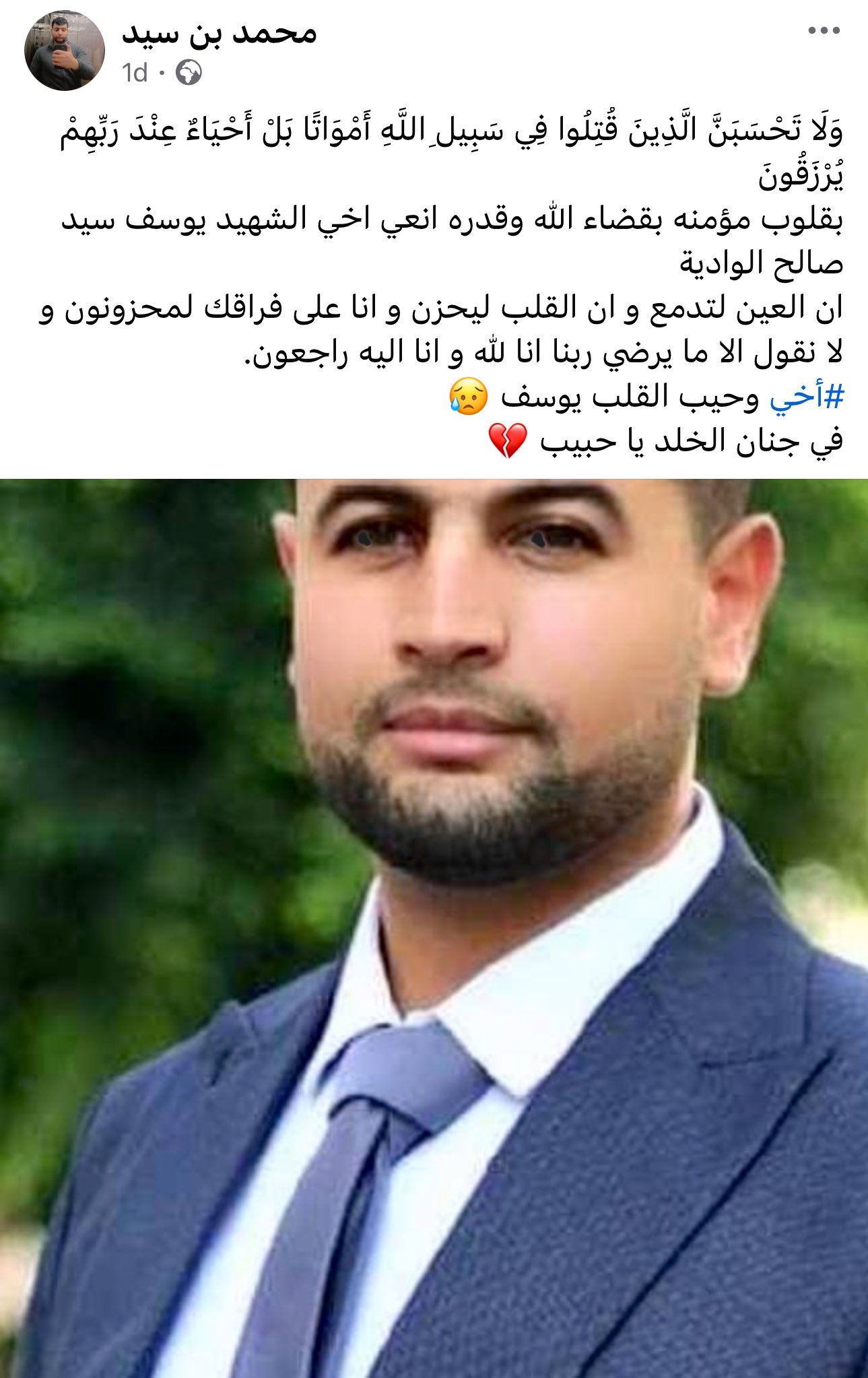 Yusuf Al-Wadiya was killed by Israel at his home two days before the massacre.
