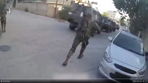 Bodycam footage published by the IDF later in the day titled “Morning activity by IDF soldiers clearing Jenin” shows soldiers moving through one of the same alleyways shown in the B’Tselem video. A comparison of these two videos indicates that the armed men in Video Two and the IDF soldiers in the bodycam video were located in parallel alleyways. It also appears to suggest that the two groups were engaged in a firefight at around the time that Abu Akleh was killed.