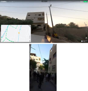 Note that the building in the IDF bodycam footage (top) matches the building seen on Mapillary (bottom) approximately 220 metres south on the street from the location where Abu Akleh was shot (Source: Twitter/Mapillary)