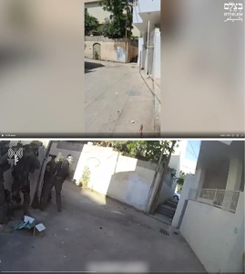 The image comparison above shows a frame from the B’Tselem reference video (top) and one from the IDF bodycam video (below). Note that the IDF soldiers are standing on the same corner by the stairs that was filmed by B’TSelem later in the day. One of the IDF soldiers is aiming his rifle down an alley towards the location of the armed men in Video Two (Source: Twitter)