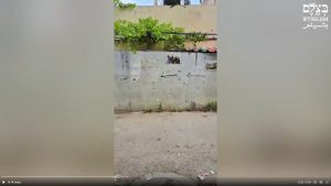 While the IDF body camera footage and the Telegram videos show that the IDF was in control of a section of the street approximately just under 200 metres from the location where Abu Akleh was shot and killed, video evidence appears to show that control of nearby side streets was contested. There is no available footage or imagery that suggests any Palestinian combatants were stationed between the IDF soldiers and Abu Akleh at any stage. However, a social media video (referred to from now on as “Video Three”) does show a group of men on a street corner nearby. The men appear to be in the midst of a firefight. The video can be geolocated to this location (seen here on Mapillary), approximately one block south of the IDF armoured vehicle convoy. Multiple shots can be heard being fired in quick succession.