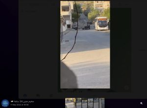 A video shared on Facebook and uploaded onto the platform at 6:40 AM shows the same IDF vehicle convoy driving by and coming to a stop at the same location where they are observed in the IDF body camera footage. The upload time places an upper limit on when the IDF soldiers arrived on the scene: in other words, the video must have been recorded prior to 6:40 AM, when it was uploaded onto Facebook. Because the video appeared to be recorded from inside a home, we will not link to it out of a concern for the safety of the person who recorded it. The IDF position at the end of the bodycam video was also recorded in a series of six videos by a camera crew approximately 100 metres north, roughly between the IDF position and the spot where Abu Akleh was shot. These videos were posted to Telegram.