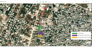 The image above shows the spot where Abu Akleh was shot and killed (red circle), and the positions of the parties seen in Video Two, Video Three, and the IDF body camera footage. The green rectangle represents the position of the IDF armoured vehicles; the purple rectangle represents the position of the armed men in Video Two, while the yellow rectangle represents the position of the armed men in Video Three. (Source: Bing Maps).
